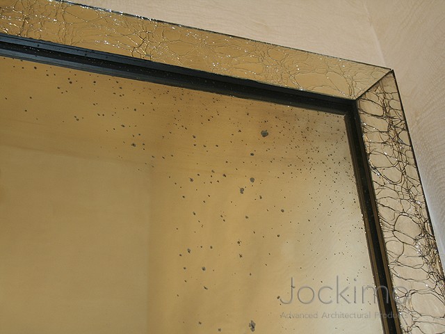 This mirror features “floating” mouth blown crackle glass frame @ 3” wide by 1” deep with mitered corners. Tarnished distressed and silver finishes available. Available in most MirrorUnique™ antique mirror finishes on mirror field. (This photo shows an Antique Pinhole mirror as the main body.)