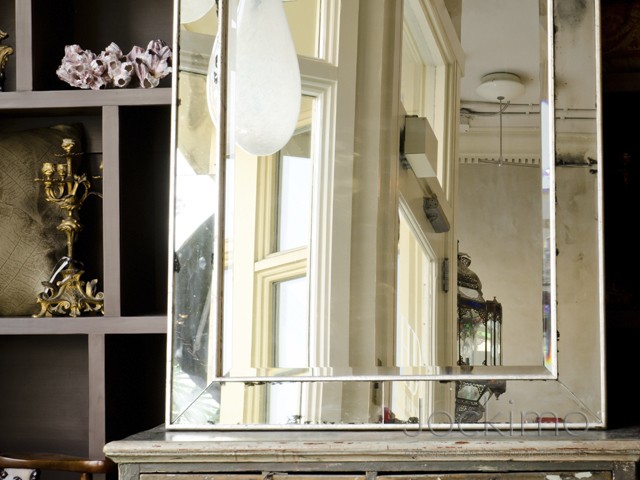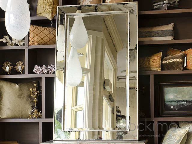 The wood frame is 4” wide, 2” deep with a 5/16” reveal of wood flanking the glass inlay on both sides. The frame finish is typically silver leaf but can be gold leaf, stained, painted or lacquered. Available in custom sizes and available in most MirrorUnique™ antique mirror finishes.