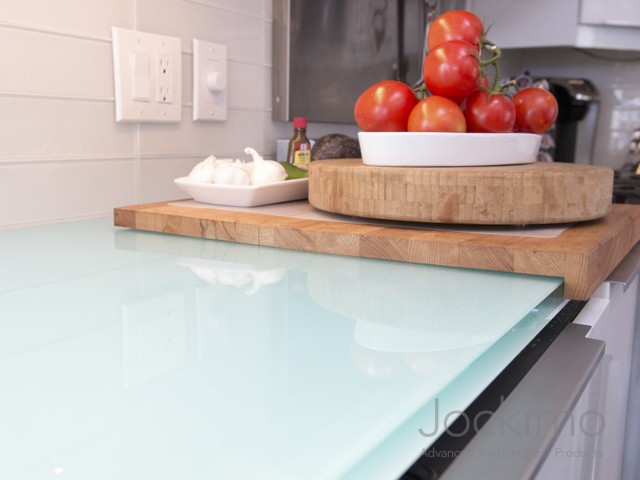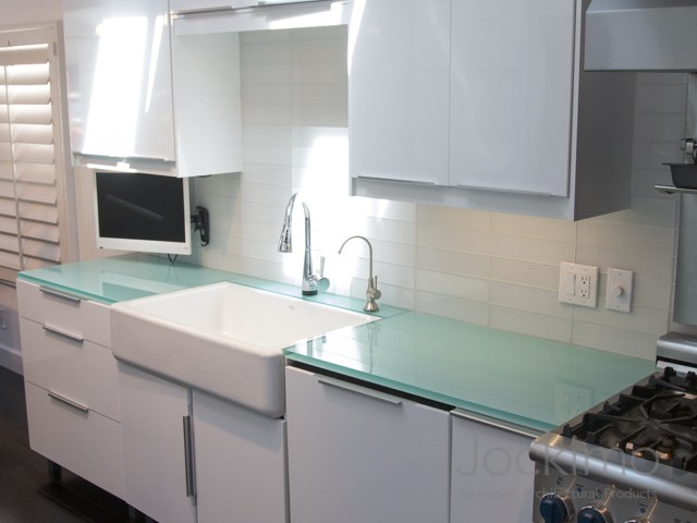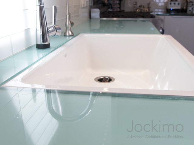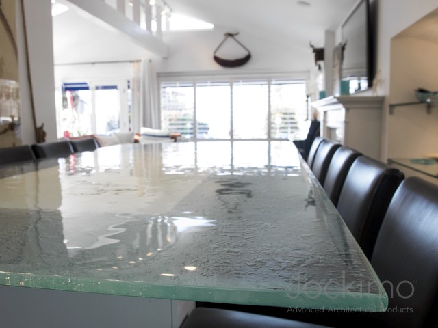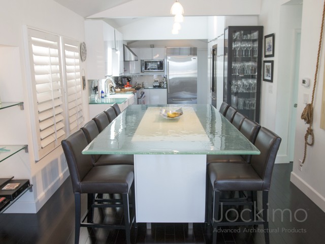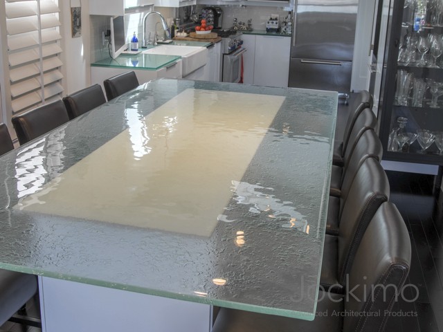 Private Residence - Southern, CAJockimo produced 1" ThickGlass™ in low iron for the dining room table. The texture is Jockimo's Small Rocks. The kitchen counter tops are 3/4" back painted glass.