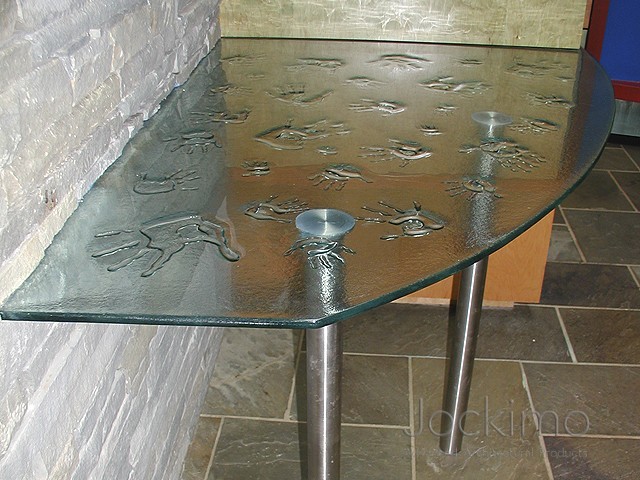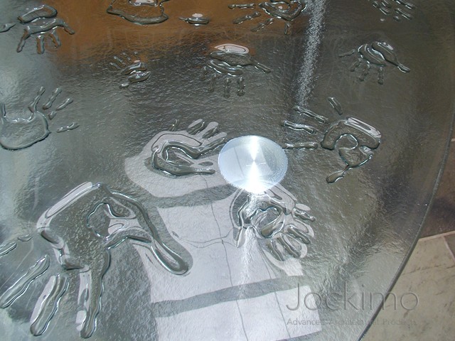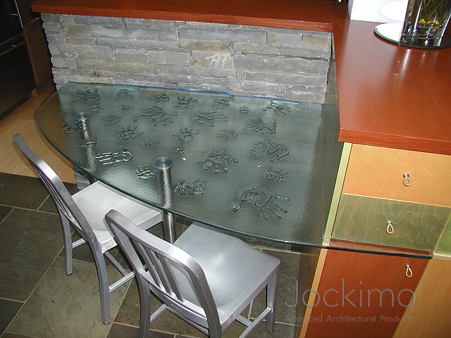 Our customers wanted their five children to participate in the design of their play area glass by providing hand prints. The hand prints were provided to Jockimo and in turn transferred to a custom mold providing a very special piece of glass for the family.