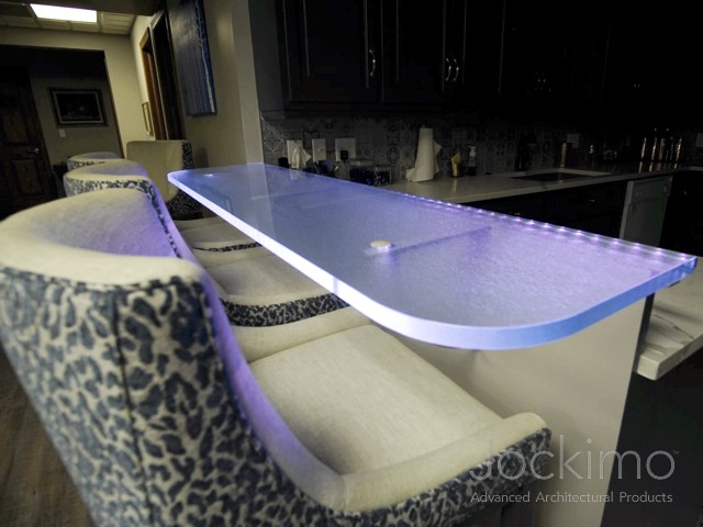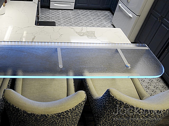 This 1” thick Low Iron ThickGlass™ is 72-3/4" x 17” and all edges are polished. The LED lit edge on the flat 72-3/4” side was provided through Jockimo's exlcusive edge "lip" that allows the lights to sit inside of the glass. The LED lights and all required power were provided by Jockimo.